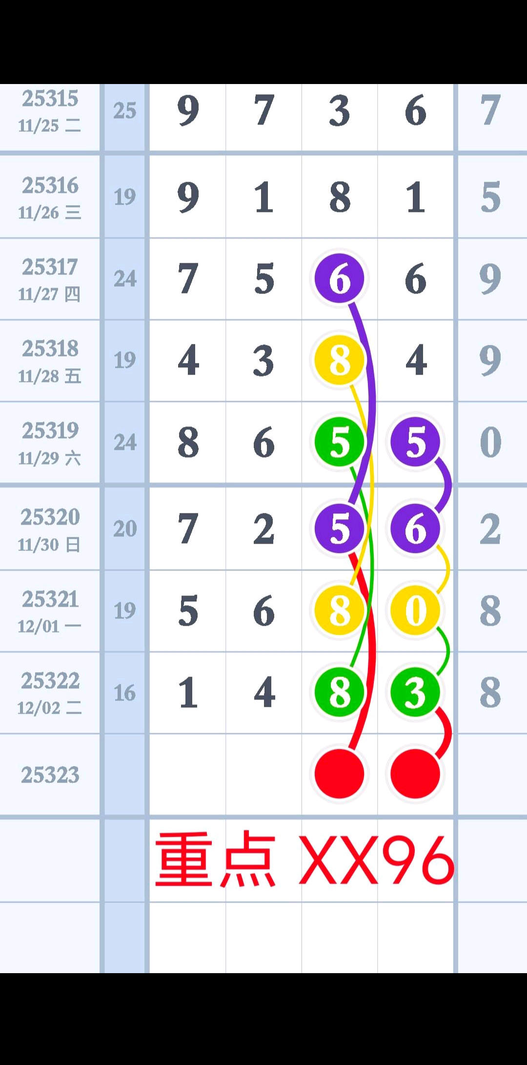 - 本期主攻中肚,走重对或百位+2=十位,也可考虑百位+5=十位+4。