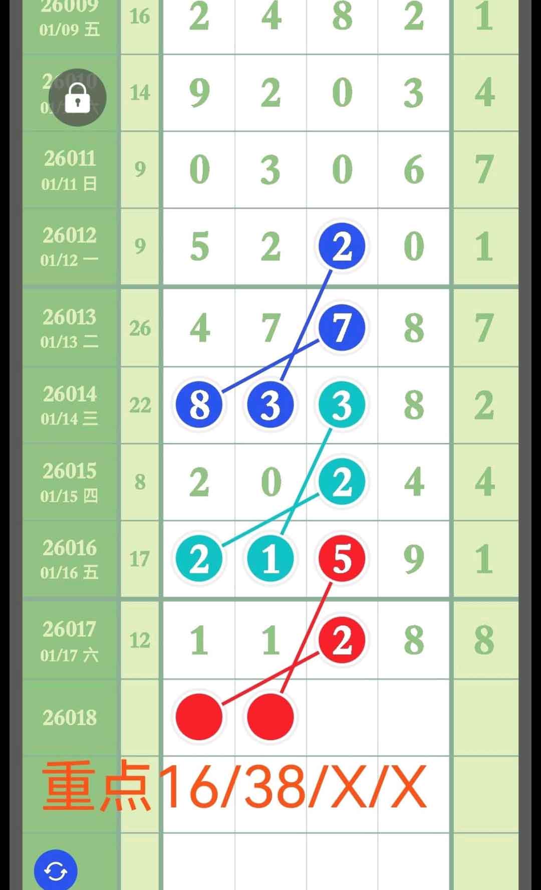 本期16有数,38有数,千百27差分,中肚重对,头尾38差分。