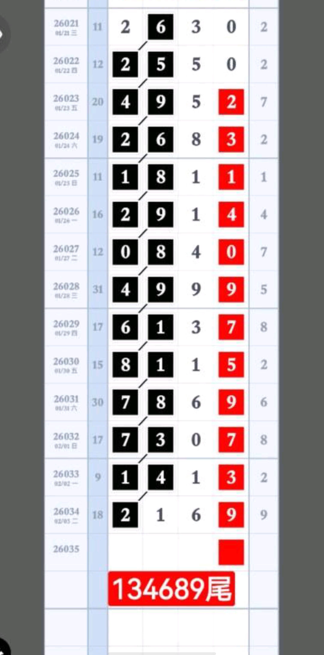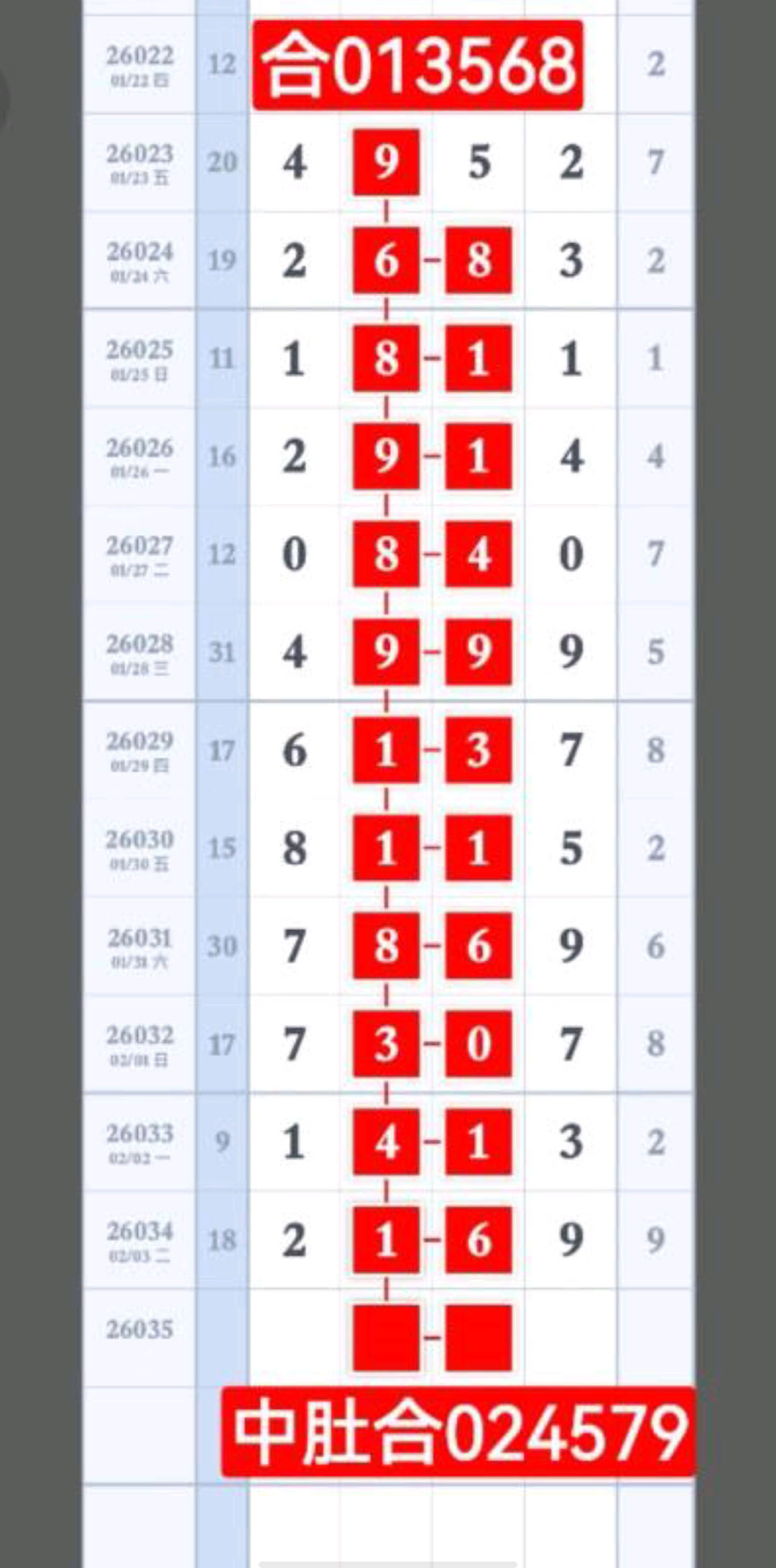 头尾合023578、中肚合024579,14689尾,中奖欣喜,贵在参与。