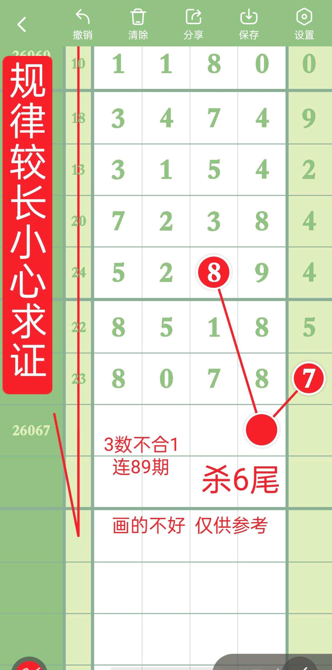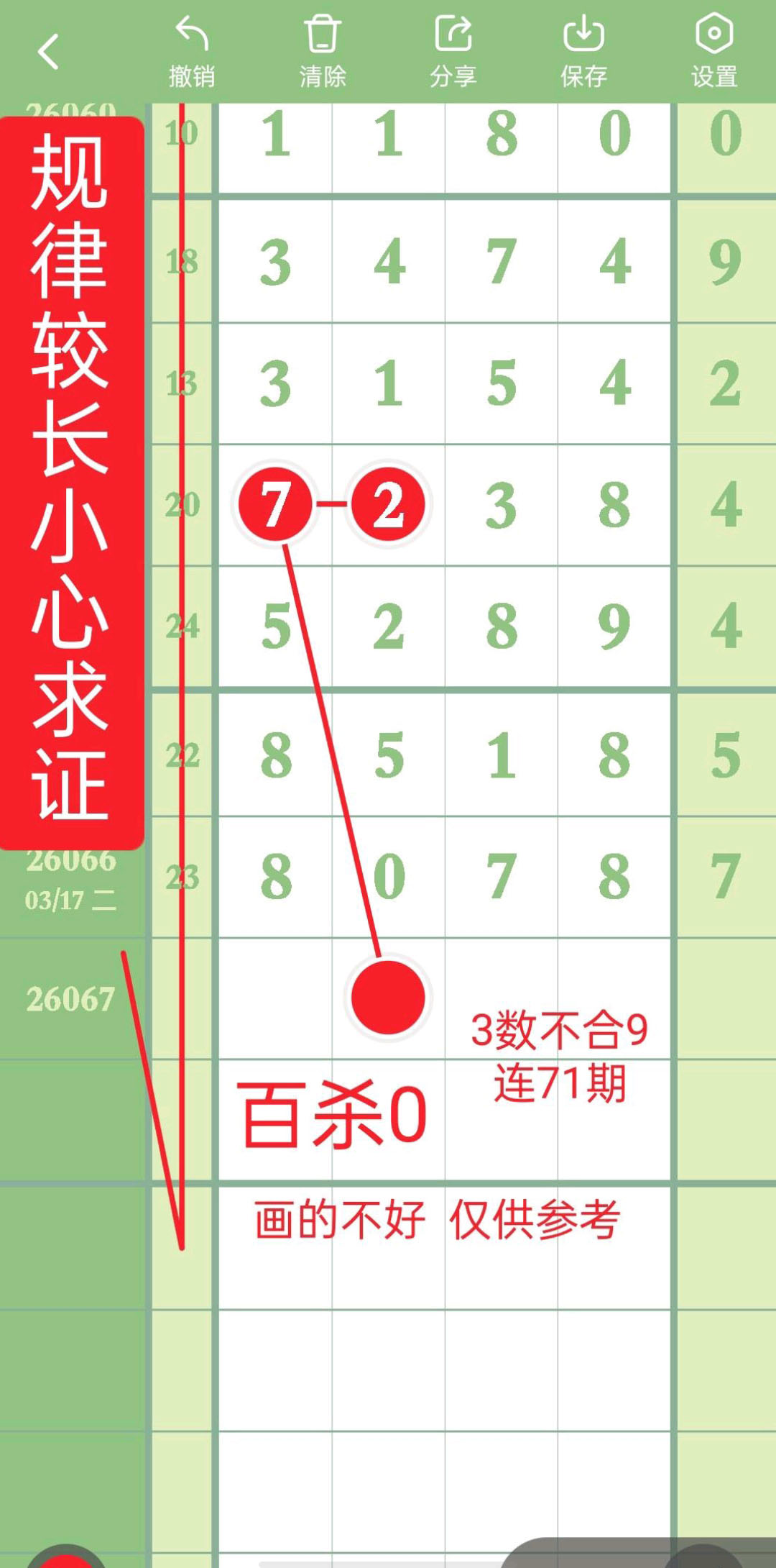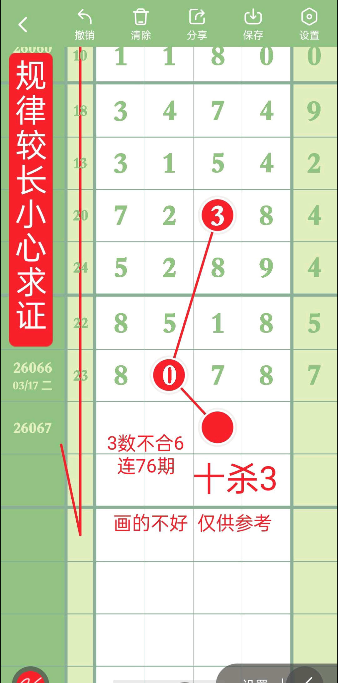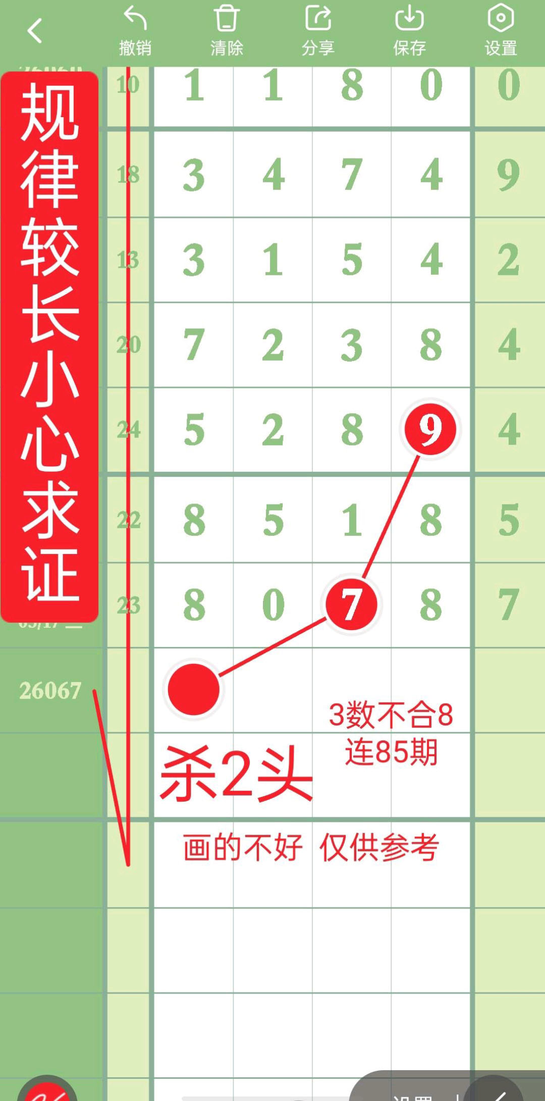 - 排除规律走得比较长,小心求证,杀2头,百杀0,十杀3,杀6尾。