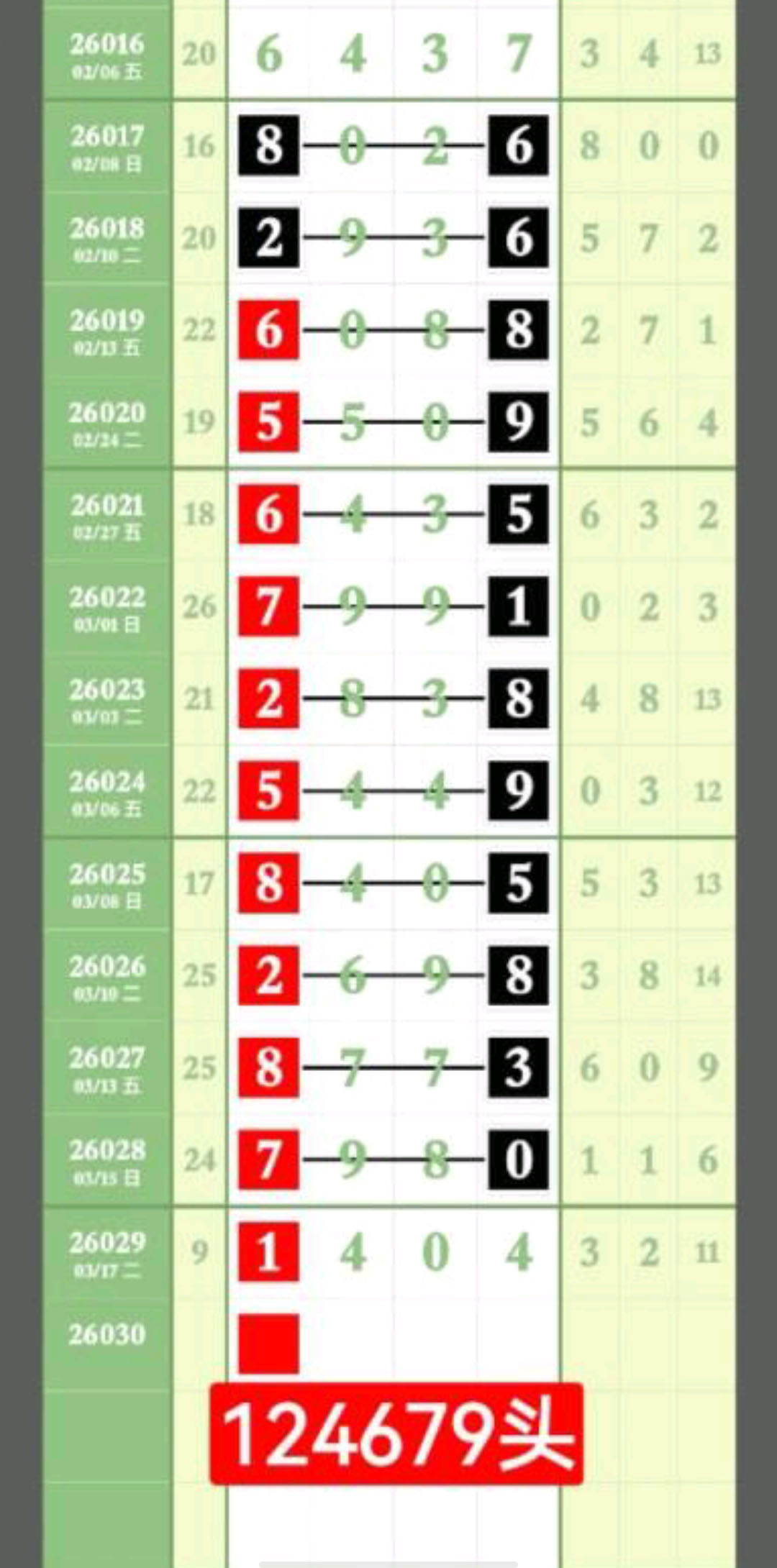 - 日日有好料,期期出芝麻,134689/024579/013568/234789。