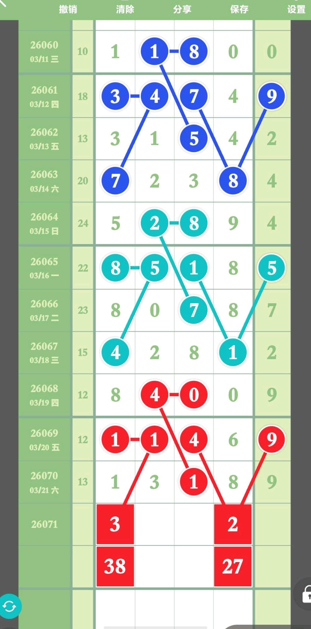 - 头尾二定27XX38,倒着防38XX27,重点2XX8、3XX7,单吊3百位,5十位。