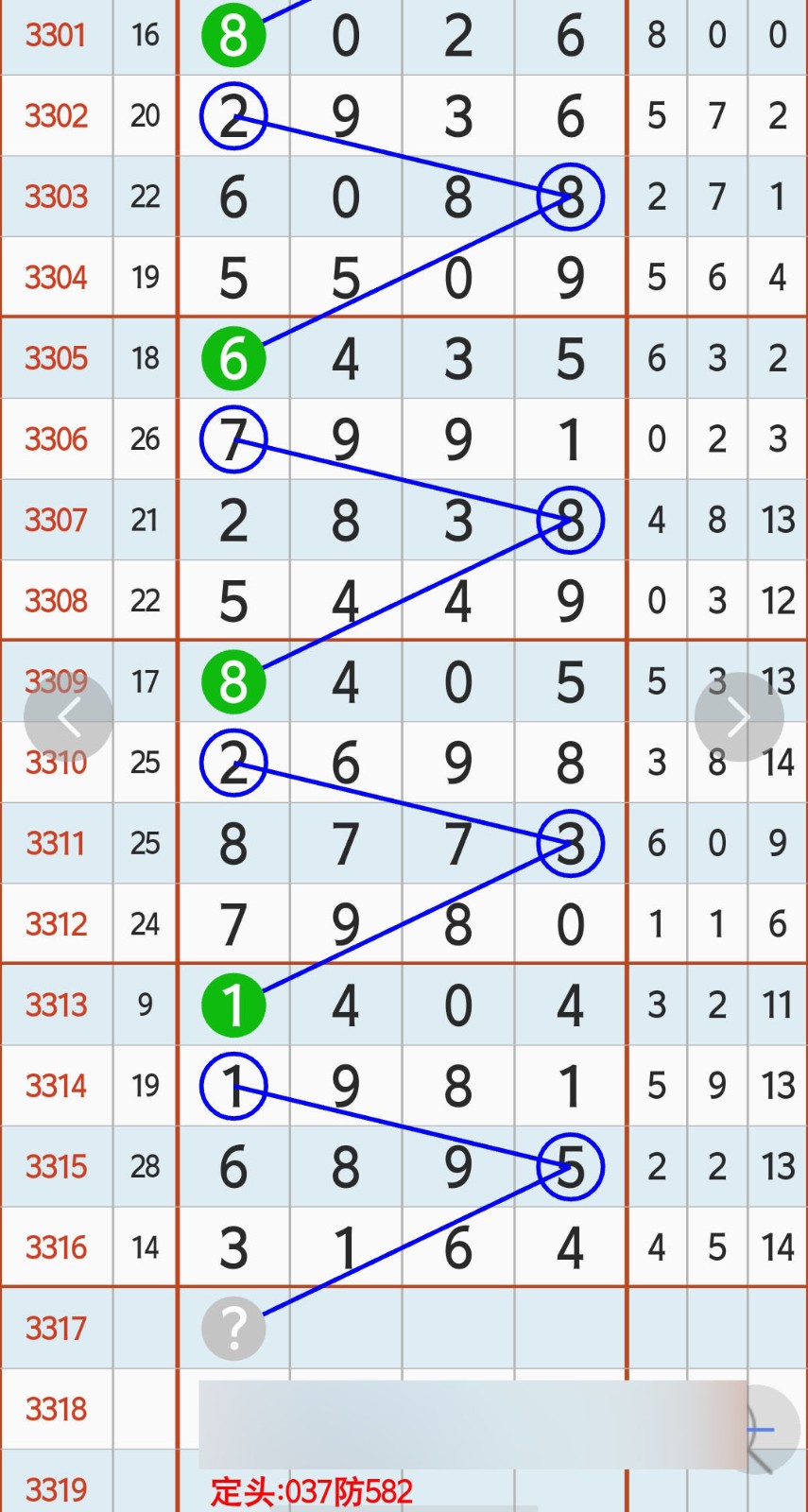 - 定037防582头,037防582百位,0357防82十位,1358防60尾。